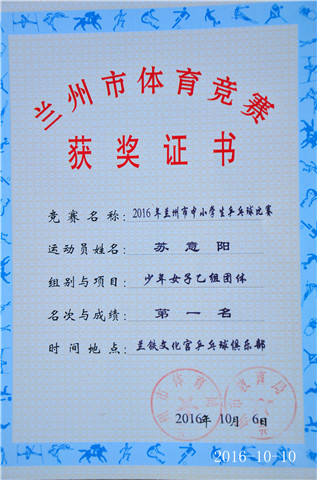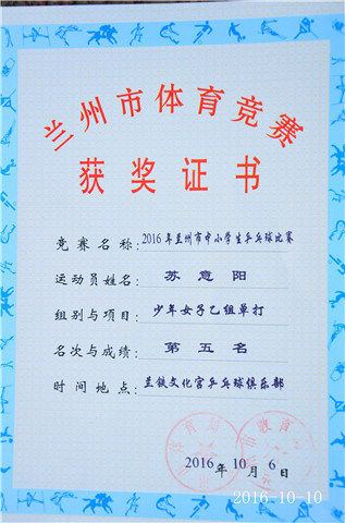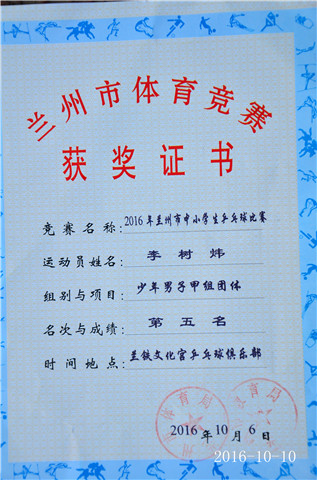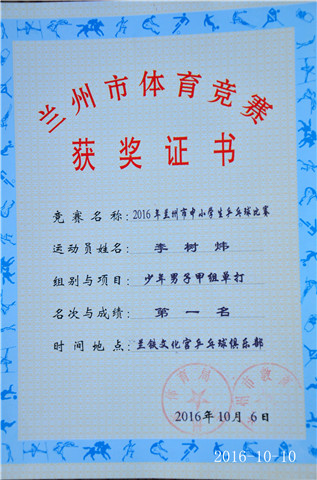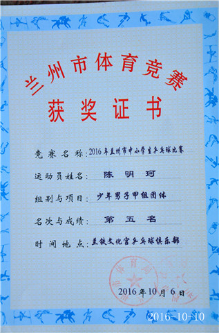 升国旗、唱国歌 李树伟:荣获少年男子甲组单打第一名 荣获少年男子甲组团体第五名 苏意阳:荣获少年女子乙组团体第一名 荣获少年女子乙组单打第五名 陈明珂:荣获少年男子甲组团体第五名 获奖证书 获得流动红旗班级代表合影