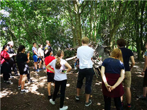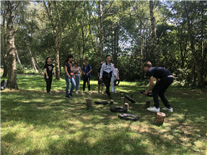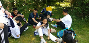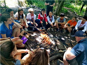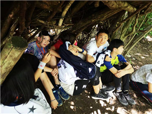 第一个活动是在树林里进行,每个小组又分成两队,教练要求同学们用树枝和提供的毡布四十分钟内搭建一所房子,大小要能容得下全队成员,并且要以泼水的方式来检验牢固和紧实程度。命令一下,两队成员迅速开始行动,分工协作,不怕脏更不怕晒,生怕落在对手的后面,充分体现了大家的团队合作意识和动手实践的能力。后来教练又带着大家体验了最原始的烤面包方式,大家通过摩擦起火的方式找到火源, 在树林的空地上用干柴生起一堆火,然后围坐一圈用提前削好的树签烤面包吃,估计这是大家伙第一次尝试这么原始的烤面包吧,一个个只称赞非常好吃。