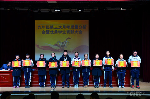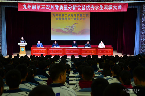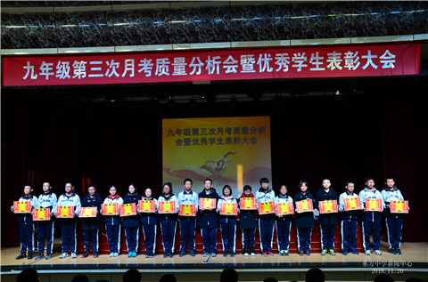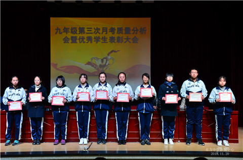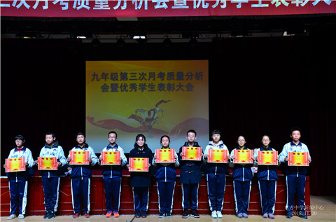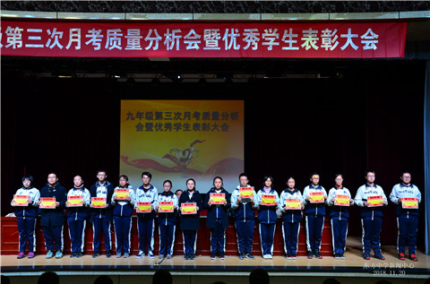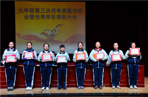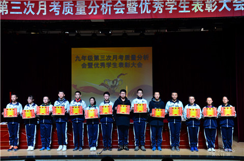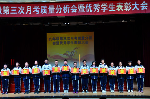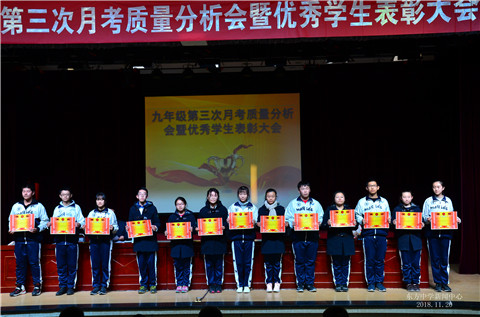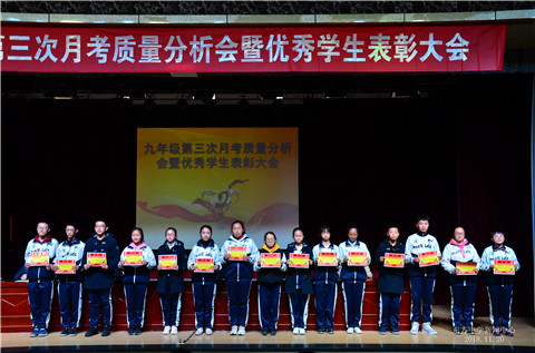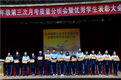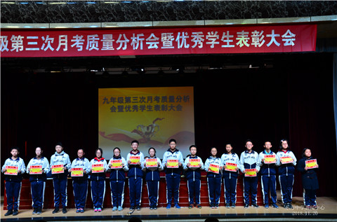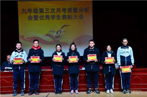 本校讯 11月12日至16日,初三年级进行了第三次月考,为了总结经验、表彰先进、找出差距、齐头并进,初三年级组于昨天下午召开九年级第三次月考质量分析会暨优秀学生表彰大会。汤自安校长等校委会领导出席会议,大会在五楼学生礼堂举行,初三年级组长秦瑜老师主持此次表彰大会。