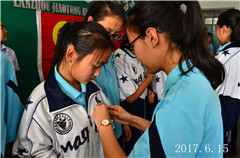 学生处老师为各班团支书志愿者佩戴志愿者徽章