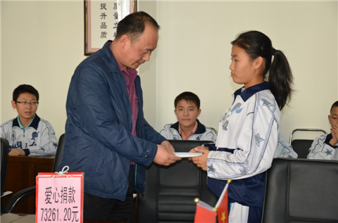 9月16号,我校领导将全校师生为初二(4)班鲁哲全同学所捐的爱心捐款转交给鲁哲全家长。初二(4)班学生向鲁哲全家长转交全班同学写给鲁哲全的信。兰州晚报记者也同时到场,采访了鲁哲全的家长,了解相关情况。希望让更多的人知道鲁哲全的情况,能够帮他收集更多的希望。