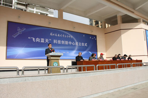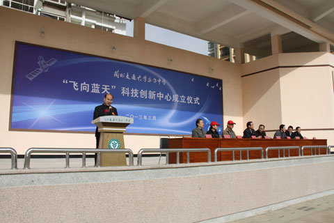 “飞向蓝天”科技创新中心成立仪式由俞吾源副校长主持。在启动仪式上,汤校长发表了重要讲话。他说:“中心的成立标志着我校的科技创新工作已经推向一个新的高度,也说明了我校在内涵发展的道路上迈开了新的步伐。”汤校长还勉励全体师生,要大力支持并参与科技创新活动,努力营造好科技创新的良好氛围,为国家实施科教兴国战略,实现中华民族伟大复兴做出应有的贡献。