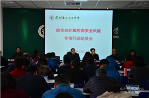 本校讯 为贯彻落实全国、省、市学校安全工作会议精神,维护和谐稳定的校园环境,全力保障学生安全,学校于3月20日下午在综合楼二楼会议室召开“防范和化解校园安全风险专项行动”动员大会。汤自安校长等校委会领导及全校教职员工一同参加了此次大会。