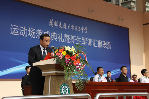 俞吾源副校长主持了本次庆典,他勉励新生,希望同学们把军训中形成的良好精神面貌延续下去,刻苦努力,顽强拼搏,以优异的成绩在东方书写绚丽的人生篇章。同时他还 表示要以感恩之心加倍珍惜爱护新建的操场,以自觉的锻炼彰显青春的风采。