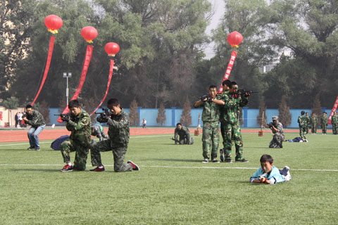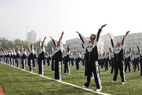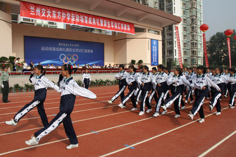 庆典现场还进行了2012级新生的军事汇报表演。在雄壮嘹亮的《中国人民解放军进行曲》中,13个军训方队整齐排列,同学们个个英姿飒爽、气势昂扬,等待迎接学校领导、老师和家长的检阅。紧接着,队列表演开始了,全体同学步伐坚定、口号洪亮,动作整齐划一,充分显示了东方学子良好的精神面貌。2012级新生以优异的表现向学校和自己交上了一份满意的答卷。军训成果汇报演出结束后,初二年级的同学们又以精彩绝伦的团体操、刚柔并济的武术、动感激情的啦啦操表演庆祝新操场的落成。
