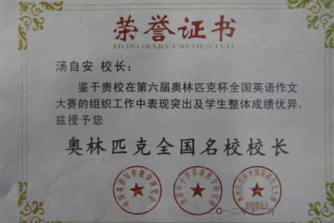 大赛由中国英语写作教学研究会、全国中小学英语教学研究所和奥林匹克全国英语作文大赛组织委员会联合举办。其宗旨是促进学校教育教学活动的开展,全面推进素质教育,为社会培养创新型英语人才并向英语方面有专长的学生提供展示才能的机会。我校秉承大会宗旨,积极备战参赛。在大赛中我校学生取得了一等奖101名,二等奖173名,三等奖243名的优异成绩。校长汤自安被授予“奥林匹克全国名校校长”的称号;陈静、冯洁颖、马英栋等15名教师荣获“国家级指导一等奖”;李玲婕、魏锦娣、徐海珍等15名教师被授予“全国英语教学能手”称号;何佳源、江萍、司季英等15名教师被授予“奥林匹克教练员”称号。