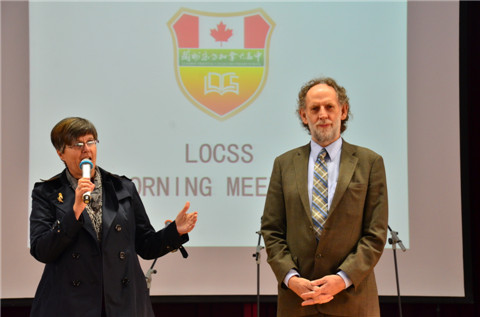 加拿大BC省教育部官员Ms. Bev Pulyk和Mr. John Zuidhon向全体师生发表了演讲,赞誉了学生在晨会上的表现。